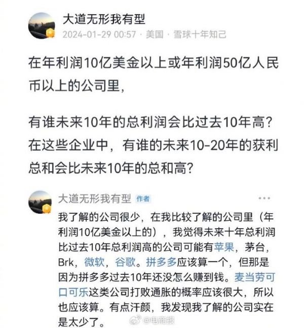 段永平透露未来十年,看好苹果,微软,拼多多等公司,总利润可能比过去10年高。