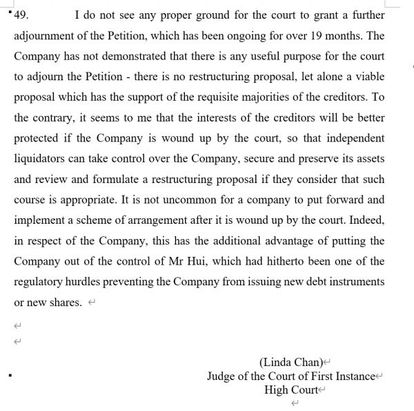 公司被法院清盘后提出并实施安排方案的情况并不鲜见。事实上,就该公司而言,这样做还有一个额外的好处,就是让公司脱离许家印的控制,而这一直是阻碍公司发行新债务工具或新股的监管障碍之一。”