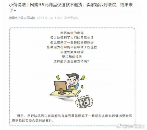 据菏泽市中级人民法院公众号通报,近期巨野法院就调解了一起拼多多商家起诉消费者恶意退款的买卖合同纠纷案件。