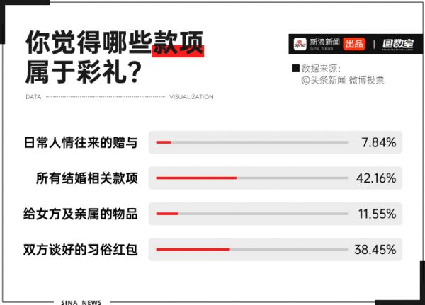 微博@头条新闻 对此发起过一项调查,42%的网友认为,所有结婚相关款项都属于彩礼;而38%的网友认为,只有双方谈好的习俗红包属于彩礼。大部分网友的共识是,日常人情往来的赠与,并不属于彩礼的范围。