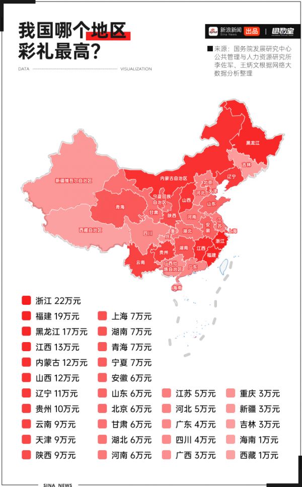有学者统计了全国各地的彩礼金额,综合看,当前彩礼的全国均值约为7万元,浙江以约22万的平均值高居第一,福建、黑龙江、江西、内蒙古、山西等地区也较高,海南、西藏等地较低,约为1万元。