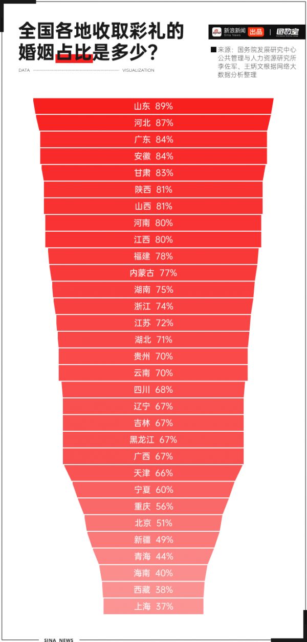 山东以89%的比例成为最流行收取彩礼的地区,河北、广东、安徽、甘肃等省收取彩礼占比也较高。上海占比37%,为全国最低,同为直辖市的天津、重庆和北京的比例分别为66%、56%和51%。新疆、青海、海南、西藏等偏远地区的比例也较低。