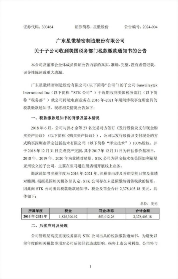 前阵子,广东大卖家星徽股份公告称,其子公司STK公司收到美国税务部门的税款缴款通知书,税金及罚金合计237.8万美元(折合人民币约1689.97万元)。其涉税年度为2016年-2021年,涉税事由涉及并购交割日前及业绩对赌期。