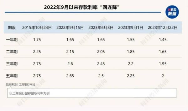 以工商银行为例,2022年9月前,该行一年期、二年期、三年期和五年期整存整取挂牌利率分别为1.75%、2.25%、2.75%和2.75%。经过四次下调后,分别为1.45%、1.65%、1.95%和2.0%。