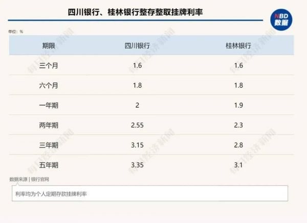 存款利率下行背景下,目前部分中小银行仍有保持相对较高利率的存款产品。如四川银行目前挂牌利率,三年期为3.15%,五年期为3.35%。此外,桂林银行三年期整存整取挂牌利率2.8%,五年期为3.1%。此外,贵阳银行成都地区3年期存款产品目前挂牌利率也仍在3%以上。