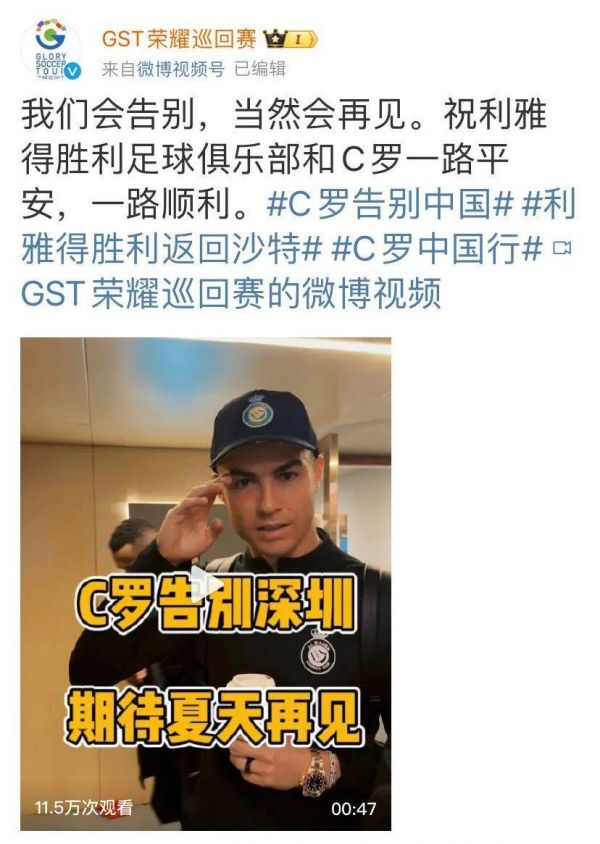 1月26日,GST荣耀巡回赛官方发布视频,C罗以及利雅得胜利全队离开深圳。