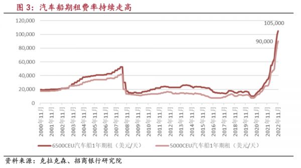 严重的供需错配导致2022年下半年全球滚装船运力奇缺,租金飙升,从一年2万美元涨至超过11万美元/每天,创2008年以来的历史最高水平,平均下来,一辆车从中国运到以色列,运费就达到1.5万元,和利润相差无几。