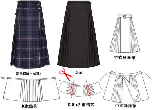关于迪奥是否抄袭马面裙,目前仍存在争议。有博主指出,当年的迪奥秋季系列作品贯穿了大量的苏格兰元素,而这条黑色百褶长裙从外观上看,也和苏格兰女裙很接近。(图/微博@那央)
