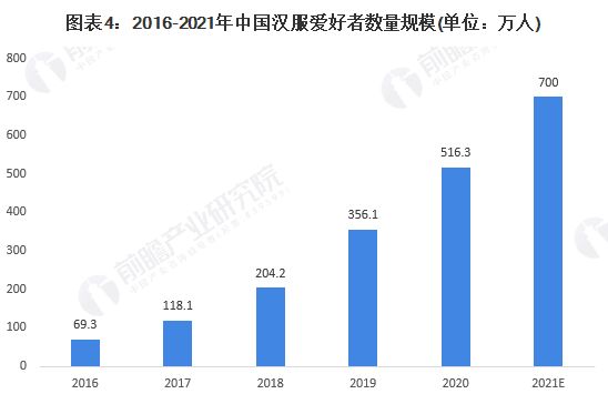 据前瞻产业研究院统计,2021年中国汉服市场规模达到了90亿元,汉服爱好者数量从2016年的69.3万人激增到700万人,实现了超10倍的增长。