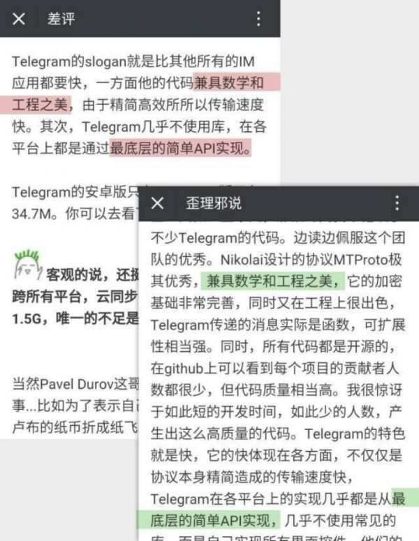 在霍炬诉“差评”公众号文章抄袭案[1]中,工程师霍炬先生作为原告,论述了自己使用独有词组作为“文字信标”的巧妙设计。他“埋”了两个独有词组:“兼具数学和工程之美”、“最底层的简单API实现”作为“暗桩”(见下图)。