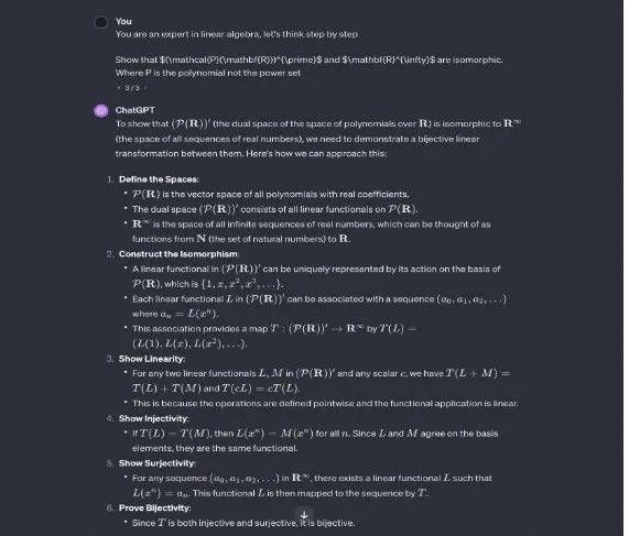 左斯琦:我本科其实学的就是数学,也非常喜欢做证明。举个例子,比如说有些证明题,我想要证明两个东西是等价的,如果自己平常去想的话,需要看很多定理以及定理的背景,但是用ChatGPT的好处就是如果我有一些东西我确实是短时间内想不出来,我可以让它给我一些灵感,它并不是每次都可以做对,但是它会自己列出它的每一个思考步骤。每一步列出来之后,我就可以去看它哪里有问题,然后我再去反问它,这么几次之后,它一般也会给我比较正确的答案。