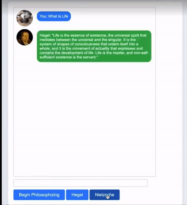 跟开发小游戏一样,我就是有这么一个想法,但具体如何去实现基本上也不是那么懂。所以我也像之前一样,把需求想清楚之后就告诉ChatGPT我要达到这么一个需求,写完之后有不对的地方我再让你改。这也是一个非常好玩的项目,大概十几个小时就完成了,而且其中主要的时间是花在如何让他们说话更像尼采和更像黑格尔,像这个聊天室可能就一个小时左右就可以做出来。