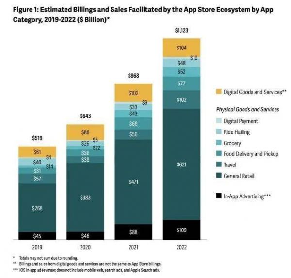 苹果在2023年5月31日援引Analysis Group的研究报告公布,App Store生态系统在2022年为开发者带来了1.1万亿美元的营收和销售额(见下图),其中来自数字商品和服务的收入为1040亿美元。根据30%的抽佣比例测算,苹果在当年抽取的“苹果税”为312亿美元。