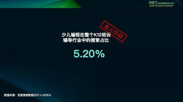 网易卡搭编程负责人曹智清在2018GET上分享中提到,在整个K12的培训辅导领域当中,少儿编程的百度搜索占比为5.2%。相比较语数外三门学科搜索都超过15%的占比来说,少儿编程仍处在幼年期。