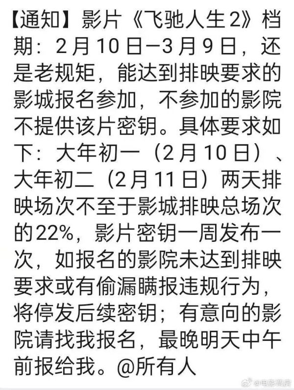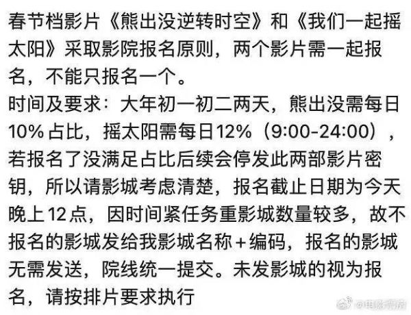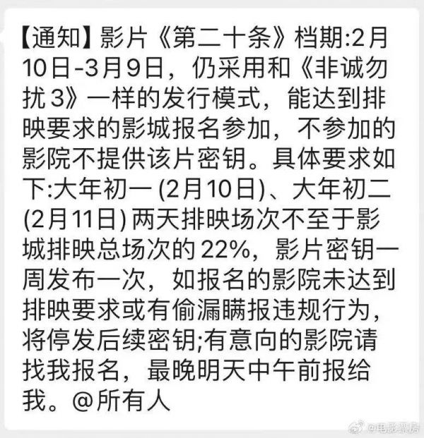 这两天,有多方消息称,今年春节档的几部头部影片均向影院发出了强制排片要求,单家3厅以上的影院,大年初一、初二单片排片量必须达到一定比例,否则将不向影院开放密钥。