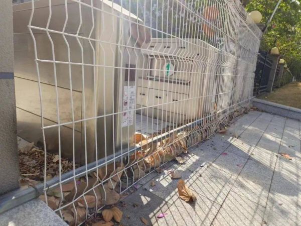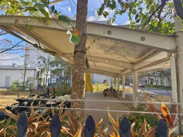 基地北门外侧是一段绿道,有政府宣传栏和石椅,石椅上有厚厚的灰尘,显然很久没人坐过。而西门门口有一个快递架子,上面只有1个快递盒。