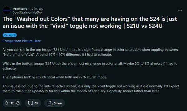 部分 Galaxy S24 Ultra 用户反映,与 Galaxy S23 Ultra 相比,其手机在“鲜艳”色彩模式下显示的色彩偏淡。这一问题仅在使用“鲜艳”色彩模式时出现,切换到“自然”模式后,色彩与 S23 Ultra 基本一致。此外,Galaxy S24 和 Galaxy S24+ 似乎也存在同样的问题。
