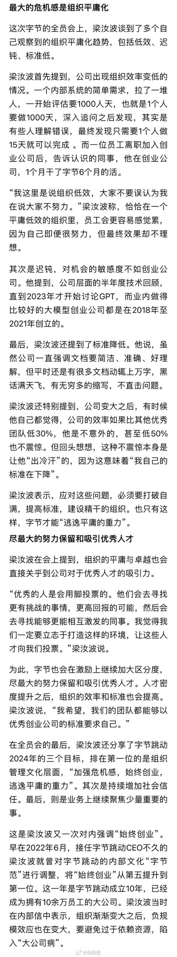 #CEO称字节该有的大公司病全有了# 2024年度全员会,字节CEO梁汝波内部讲话:最大的危机感是组织平庸化,将“加强危机感”列入年度目标。