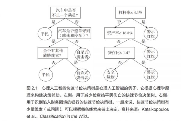 树中的第一个问题是,迎面驶来的车辆是否不止一个乘客(图 2.1, 左侧)。如果是,则推断乘客是没有敌意的平民(因为将多名 自杀式袭击者分配到一辆车上会浪费稀缺资源)。如果答案为否,则下一个问题是车辆是否会减速或停在检查站。如果答案为否,则推断车上乘客是怀有敌意的。如果是,则第三个也是最后一个问题是,是否存在进一步的威胁线索(例如关于该地区一辆可疑的绿色本田思域的情报)。该树易于记忆和执行, 可减少 60% 以上的平民伤亡。