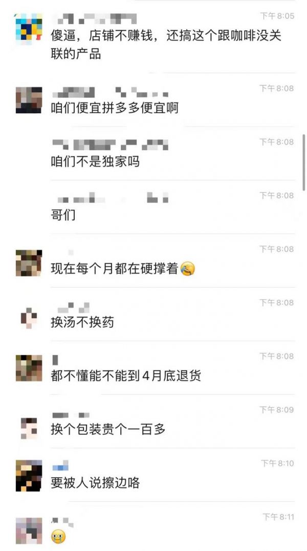 这一行为,自然也引起了不少联营商的不满,有人在社交媒体平台表示“一看订货单,我气死了”,也有联营商在内部交流群里无奈的感慨“每个月都在硬撑着”“店铺不赚钱,还搞这个跟咖啡没关联的产品”......