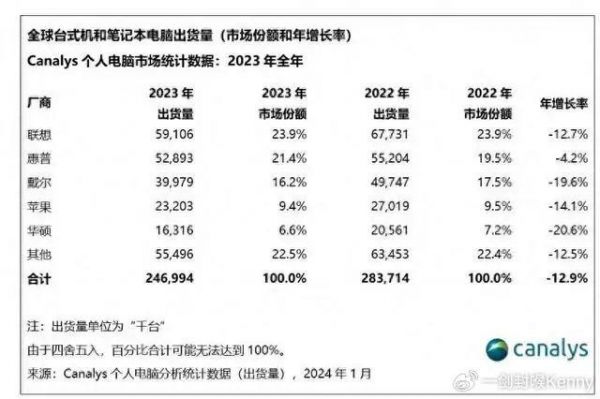 近日,知名机构Canalys发布了2023年全球PC销量数据。数据显示,2023年全球PC销量下滑了13%左右,整体出货量约为2.47亿台。