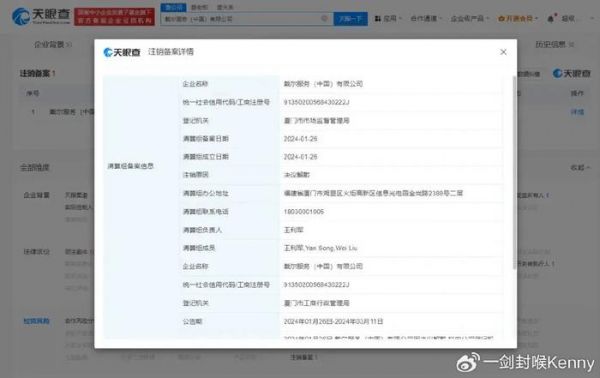 1月30日,天眼查App显示,戴尔服务(中国)有限公司新增注销备案公告,注销原因为决议解散,公告期为1月26日至3月11日。