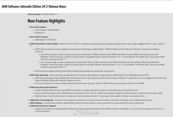 AMD现已兑现此前的承诺,于今天正式发布了AMD Software Adrenalin Edition 24.1.1驱动程序,增加了对新款Radeon RX 7600 XT显卡的支持,并且带来了玩家期待的对平滑移动帧(AMD Fluid Motion Frames,AFMF)这一帧生成功能的支持。AFMF适用于所有DirectX 11/12游戏,可以为玩家带来更流畅的游戏体验。另外该版本驱动还支持新游戏《如龙8(Like A Dragon: Infinite Wealth)》和《铁拳8(Tekken 8)》。