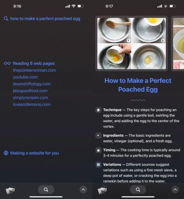 例如搜索“如何制作完美的溏心蛋”,传统谷歌搜索页面会反馈一些相关的搜索链接,而 Arc Search 则 AI 归纳主要链接的内容,直接反馈相关的操作步骤。