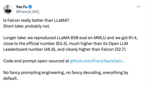 我记得有这样一起“事故”。当时的背景是,Falcon的分数很高,Llama1-65B在Open LLM Leaderboard(HuggingFace的自动化模型榜单)上MMLU的分数异常的低。最后研究下来原因仅仅是自动化测评框架有一个Bug。这个错误很快被修复了,但仍然在社区里引起了一番讨论。