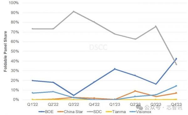 此外,中国另外三家折叠屏供应商维信诺、华星光电、天马的市场份额在2023年四季度也都有明显的提升,其中维信诺的份额已经接近15%。