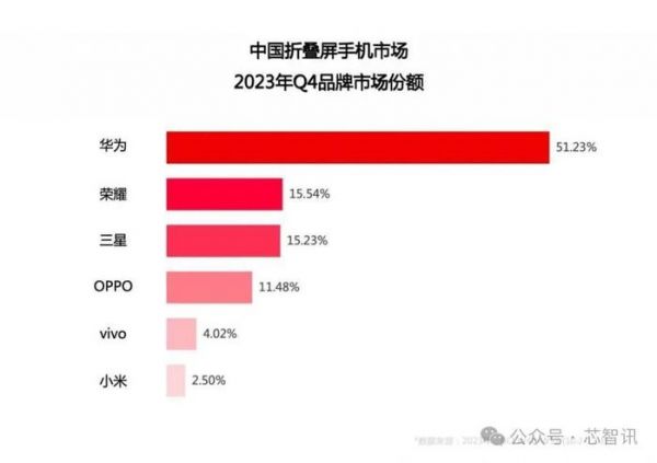 另一家市场研究机构BCI的数据显示,在2023年第四季度的中国折叠屏手机市场,华为凭借51.23%份额,蝉联国内销量第一。荣耀和三星分别以15.54%和15.23%的份额分别位列第二和第三位。随后的第四到第六的分别是OPPO(11.48%)、vivo(4.02%)和小米(2.50%)。