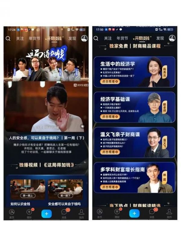 特别匹配内在属性,支付宝还于近日专门开辟“开局谈钱”频道,凭借着经济学基础课、生活中的经济学、多学科财富增长指南等系列精品课程,从距离“钱”,距离信任最近的地方入手,尝试引入新活水,撬动“支付后”的末端流量。