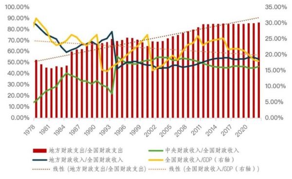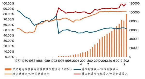 如果不考虑税收返还和转移支付,分税制改革后,地方财政收入/全国财政收入的比重从1993年的77.98%下降到1994年的44.30%,但如果考虑税收返还和转移支付,1994年地方财政的可支配收入占全国财政收入的比重不降反升到92.08%,此后一直维持在较高的水平。