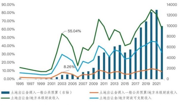 1992年的土地出让收入为520亿,1999年和2000年的数据分别是514亿和595亿元,2000年以前,土地出让收入占地方财政收入的比重都不超过10%,没有构成地方财政的主要收入来源。直到2000年住房市场化改革后房价上升带动地价上升,土地出让收入占比才逐步抬升,到2003年骤升至55.04%。