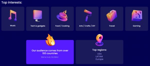 The Soul Publishing的受众以千禧一代、Z世代、青少年为主,兴趣方向主要为音乐、科技小工具、食物/烹饪、艺术/工艺品/DIY、旅行等,受众来自193个国家,其中以美国、拉丁美洲、欧洲为主。合作对象包括Crayola、amazon、audible、INKBOX、MATTEL、Govee等多类型品牌。