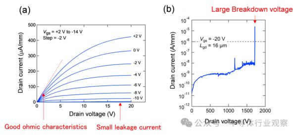 图5:(a) AlN 晶体管的漏极电流与漏极电压特性;(b) AlN晶体管的断态击穿特性。