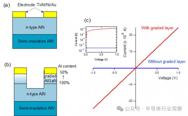 图 7:金属/n 型 AlN 接触结构(a)具有和(b)不具有成分渐变的 AlGaN 层。(c) 有和没有梯度层的电流-电压特性。