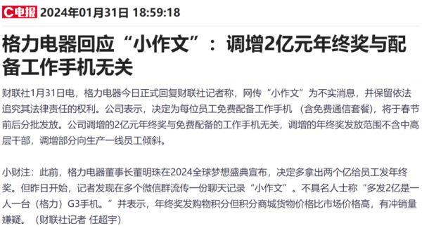 但周二开始,财联社记者发现在多个微信群流传一份聊天记录“小作文”。不具名人士称“多发2亿是一人一台(格力)G3手机。”并表示,年终奖发购物积分但积分商城货物价格比市场价格高,有冲销量嫌疑。格力电器昨日正式回复记者称,网传“小作文”为不实消息,并保留依法追究其法律责任的权利。格力电器表示,决定为每位员工免费配备工作手机 (含免费通信套餐),将于春节前后分批发放。格力电器调增的2亿元年终奖与免费配备的工作手机无关,调增的年终奖发放范围不含中高层干部,调增部分向生产一线员工倾斜。