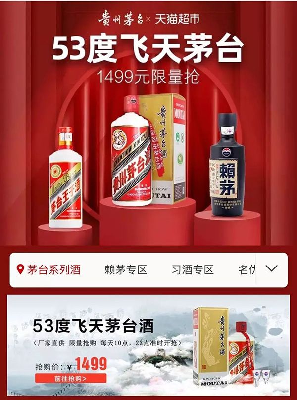 10月1日起,每天10时和22时,500ml装53度飞天茅台将以1499元/瓶的价格在天猫超市限量开售。记者咨询阿里知情人士获悉,具体店铺为天猫超市茅台官方旗舰店,但每天限售数量等信息比较保密。不过由于在天猫超市上架的茅台酒数量有限,同一用户在180天内最多购买2瓶。