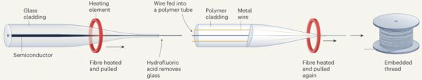 图|制作方法。首先将半导体线插入玻璃管内,两者同时加热至足够软,拉成细线,冷却后用氢氟酸去除玻璃;然后将线材与金属线材一起送入聚合物管中再次加热,拉成数百米长的柔性线。这种柔性线即可编织成能够检测和处理信号的织物。