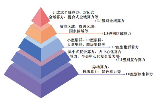 为了更好地适应和引领数字经济的发展,研究结合国内外实践经验,参照算力服务形态,并根据算力集中度,提出了具有理论价值和实践意义的五阶段算力服务演进模型,分别是:L0级别原生算力、L1级别复合算力、L2级别集群算力、L3级别区域算力和L4级别全域算力,如图1所示。