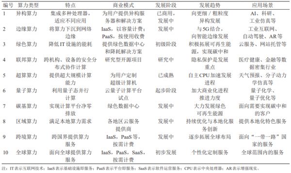 研究通过完备的调研分析,从商业模式、应用场景等不同维度出发,科学地总结了十余种典型算力服务形态,如表1所示,并对各类算力服务形态的特点、发展现状与趋势等进行了详细的分析和介绍。