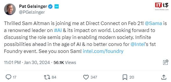 IT之家 2 月 1 日消息,英特尔 CEO 帕特・基辛格(Pat Gelsinger)近日宣布,OpenAI CEO 山姆・阿尔特曼(Sam Altman)将出席 2 月 21 日举办的首届 IFS(Intel Foundry Services,英特尔代工服务) Direct Connect 活动。