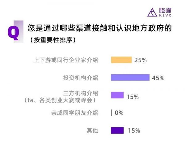 从调研结果来看,45%的科技CEO初次接触结识地方政府是通过投资机构,其次是上下游同行或其他企业家介绍(约占25%),排在第三位的是三方机构(约15%)。