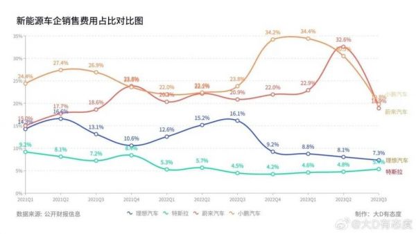 去年底时,微博用户“大D有态度”发布了一条关于“销售费用占比”的微博,称理想在2023年一步步接近做得最好的特斯拉,李想转发了这条微博称:营销和传播费用率,理想全国最低,全球只有特斯拉更低。