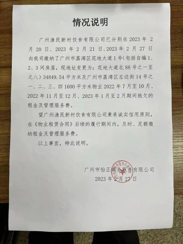 而后,渔民新村集团发布公告称,芳村店在2023年2月下旬缴清了拖欠的款项。
