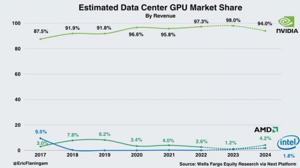 说起英伟达在人工智能领域的表现,无需赘言。2023 财年,该公司在该领域的出色财务表现备受瞩目。而根据富国银行股票研究公司的最新估计,2024 年英伟达数据中心业务的收入和市场份额将继续保持稳定增长。