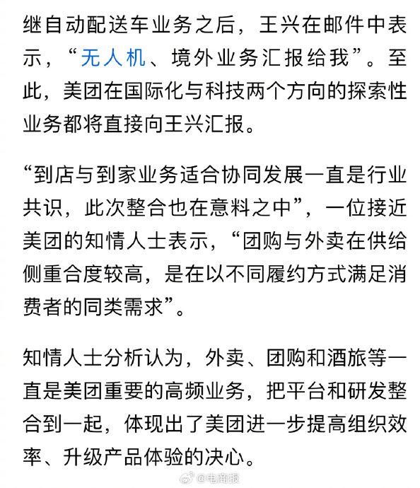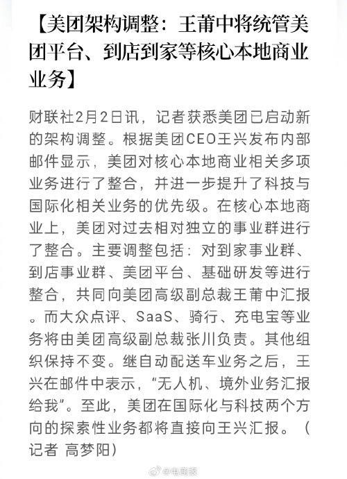 #美团宣布组织架构调整# 美团架构大调整,王莆中将统管美团核心本地业务,无人机和出海业务,CEO王兴亲自抓。