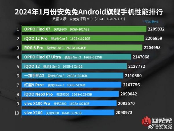 今天安兔兔公布了 2024 年 1 月的安卓手机性能榜,其中,在旗舰手机性能排行榜中,搭载天玑 9300 的 OPPO Find X7 强势取下第一名的成绩。