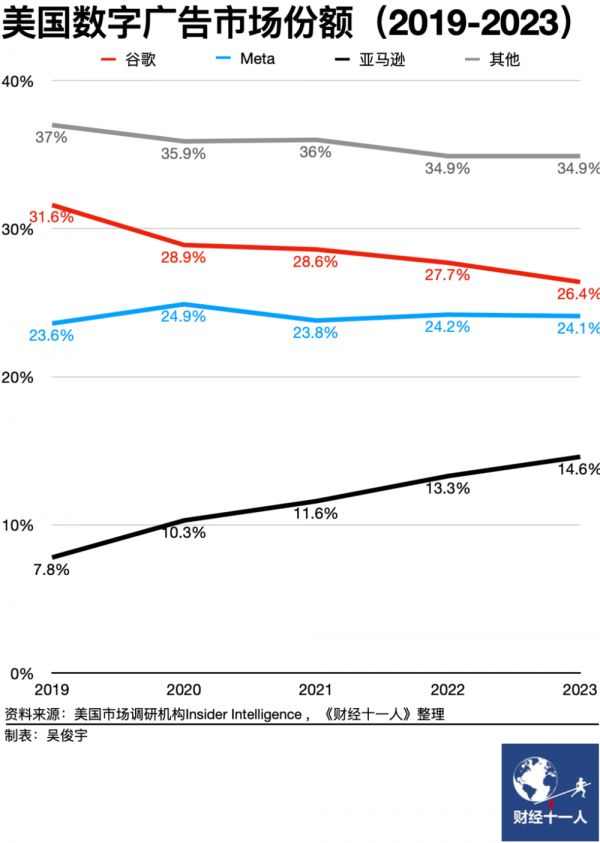 竞争对手的蚕食也加速了这个过程。亚马逊依靠电商、视频业务在不断争夺广告市场份额。TikTok、奈飞、迪士尼等流媒体公司也正在美国广告市场争夺预算。Insider Intelligence在2023年1月曾表示,TikTok在美国数字广告市场份额2022年增长了一倍以上,占美国数字广告市场的2%,预计2023年将增长至2.5%。